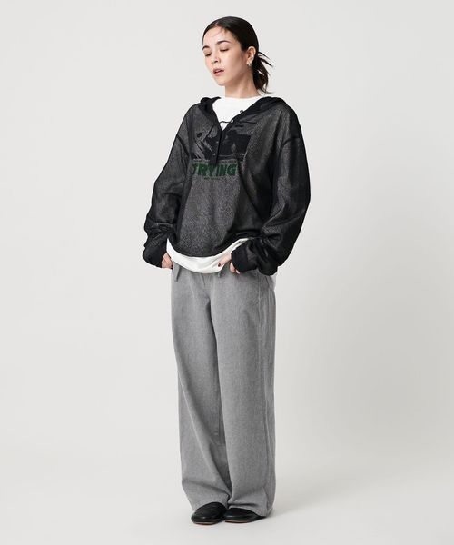 上下ともにグレーでまとめるワントーンコーデも◎。