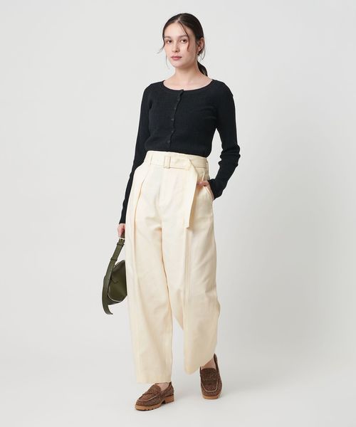 パンツのシルエットを際立たせたショート丈トップスとの合わせが◎。