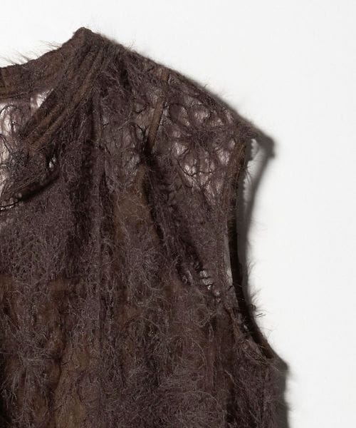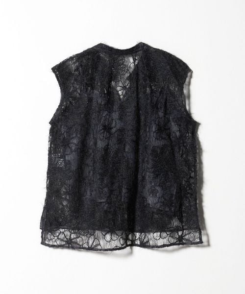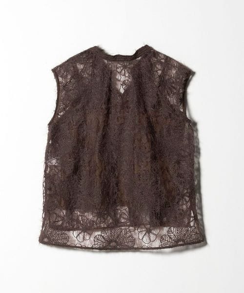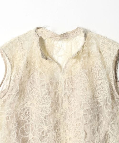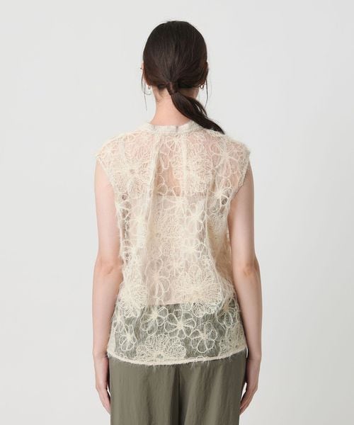 繊細なチュールに起毛糸で描いた花柄刺繍が映える、華やかで上品なノースリーブトップス。