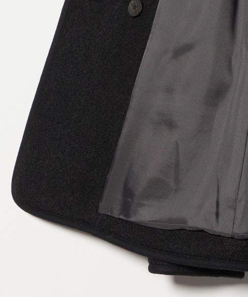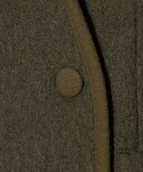 レイヤードスタイルをすっきりと見せてくれるノーカラーのフロントは、パイピングが施されて着こなしのアクセントに。