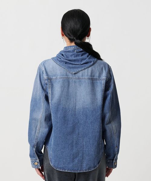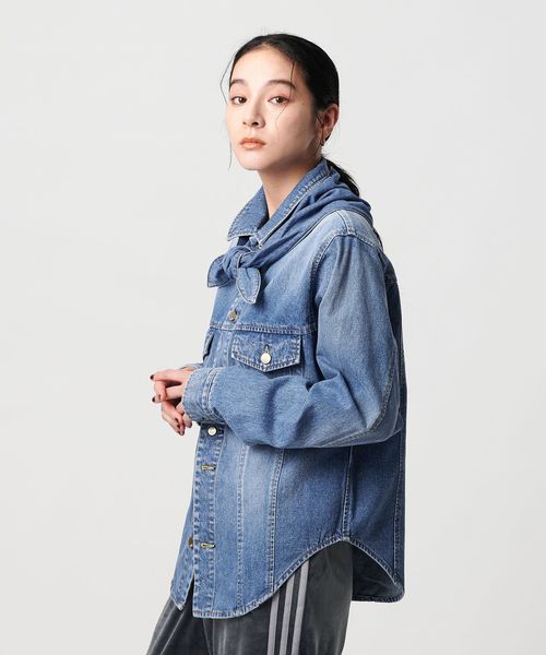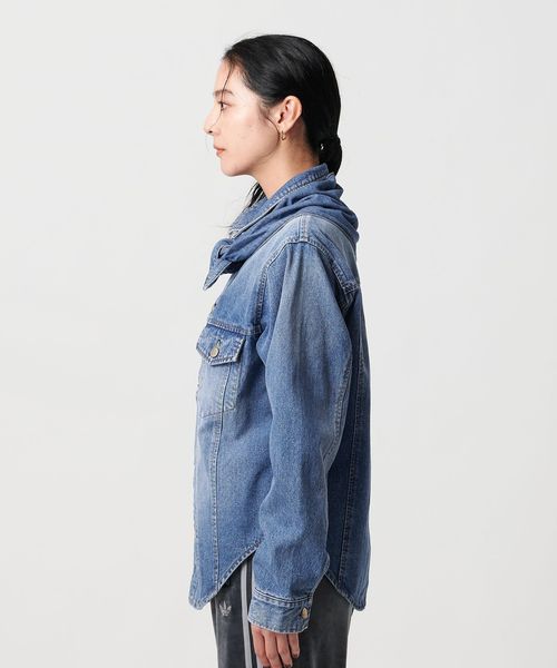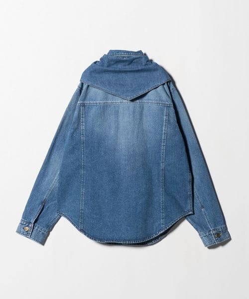 デニムジャケットのようなボタン使いやステッチの効いたスカーフ付きシャツ。