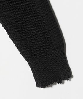 凹凸のある編地のボディは肩回りや袖、後ろ背中心がフラットに切り替えられています。