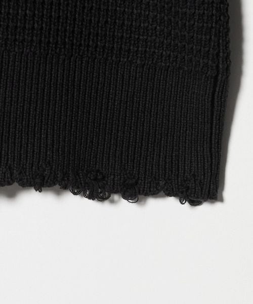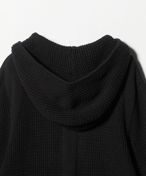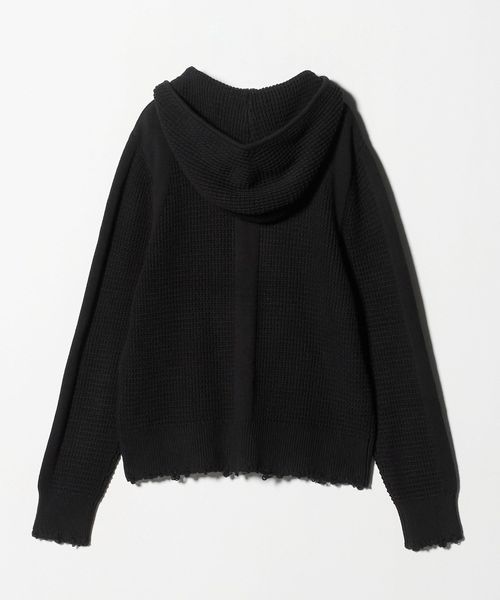 凹凸のある編地のボディは肩回りや袖、後ろ背中心がフラットに切り替えられています。