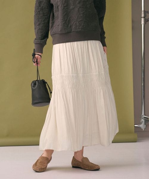 幅広のシャーリングが華やかなアクセントを添えるフレアスカート