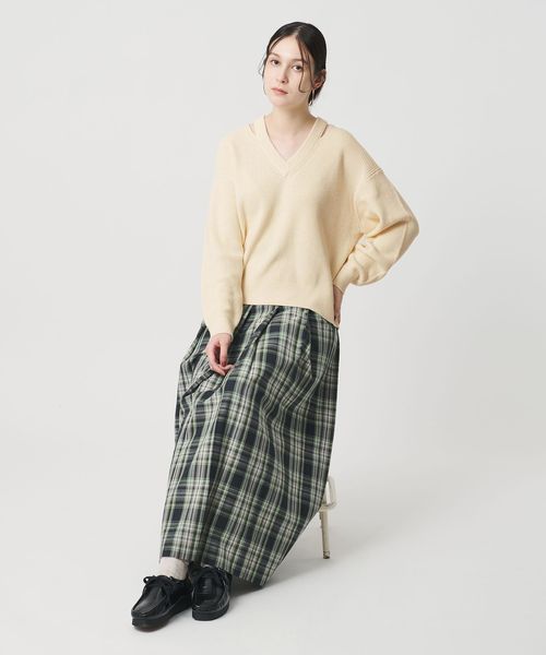 肌を露出し過ぎないVネックニットは、カジュアルからきれいめまで幅広いテイストに◎。