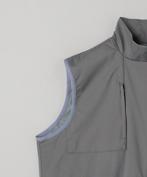 緩やかにカーブするフロントのジップデザインが目をひくベスト。