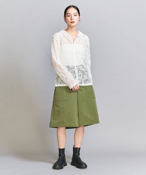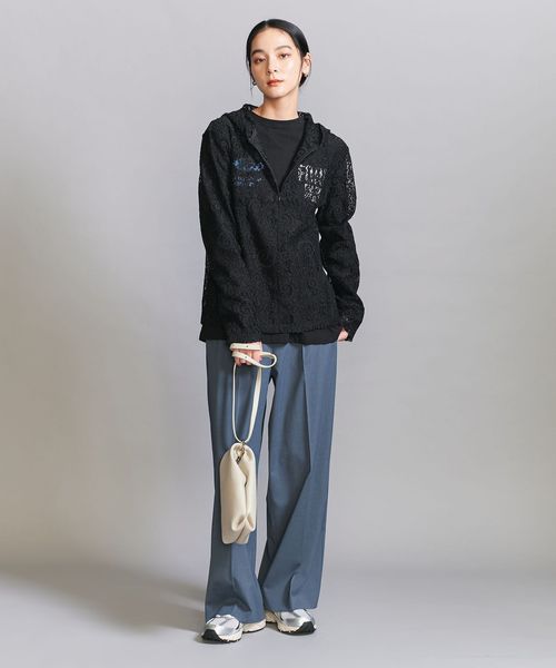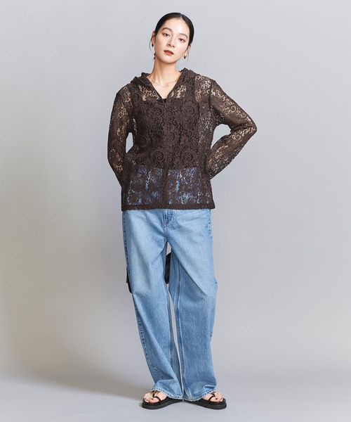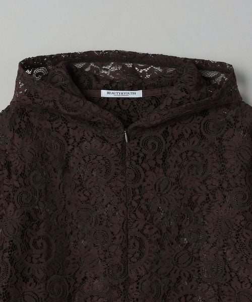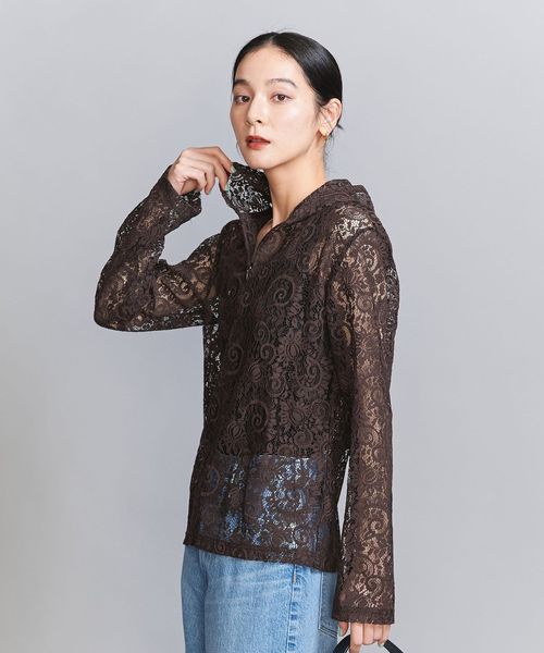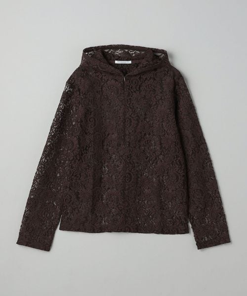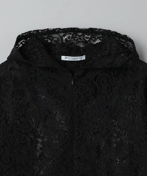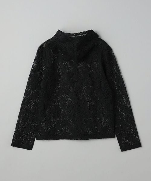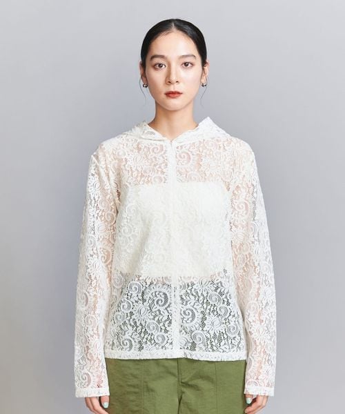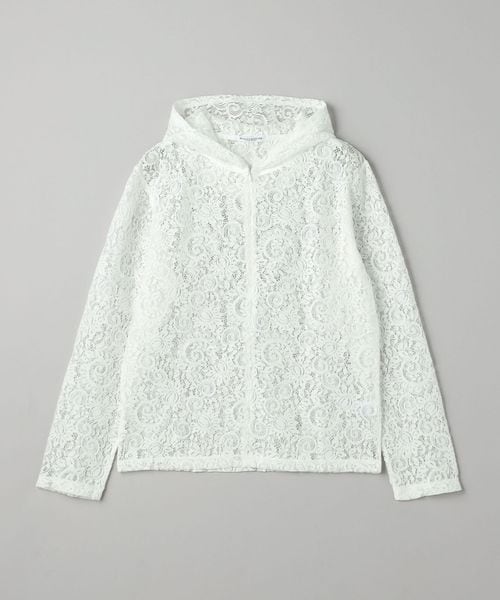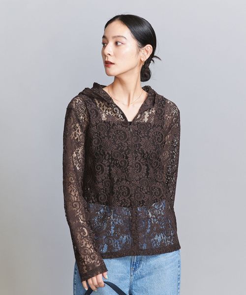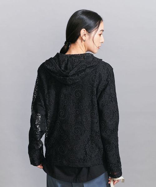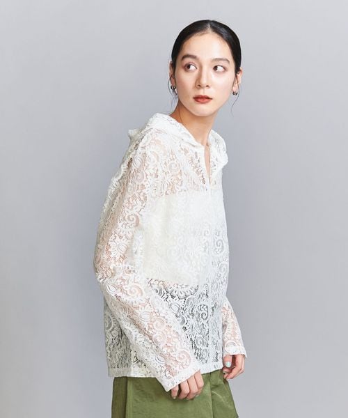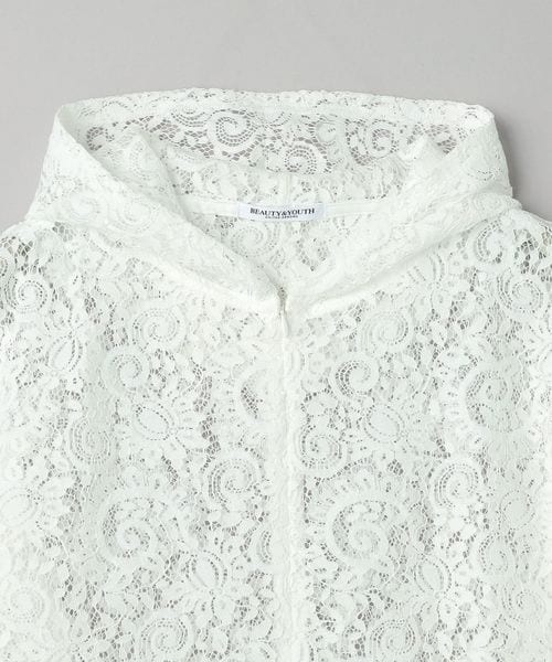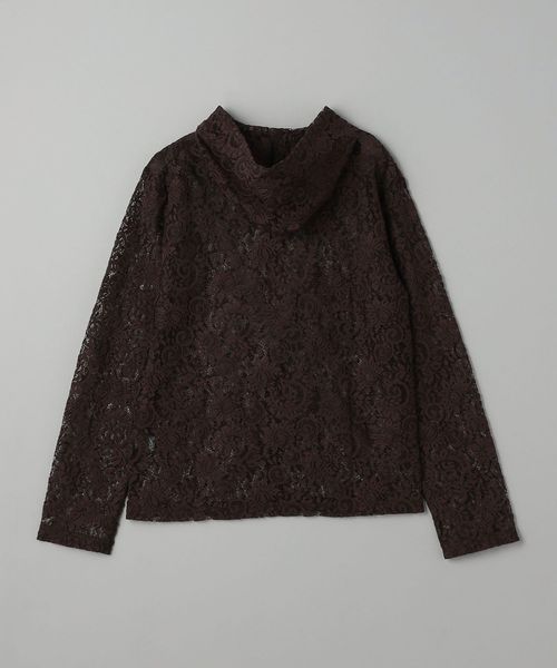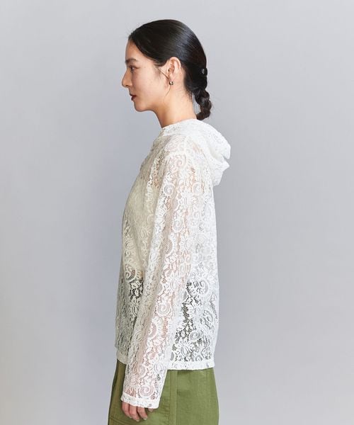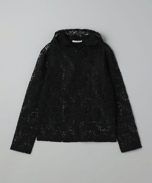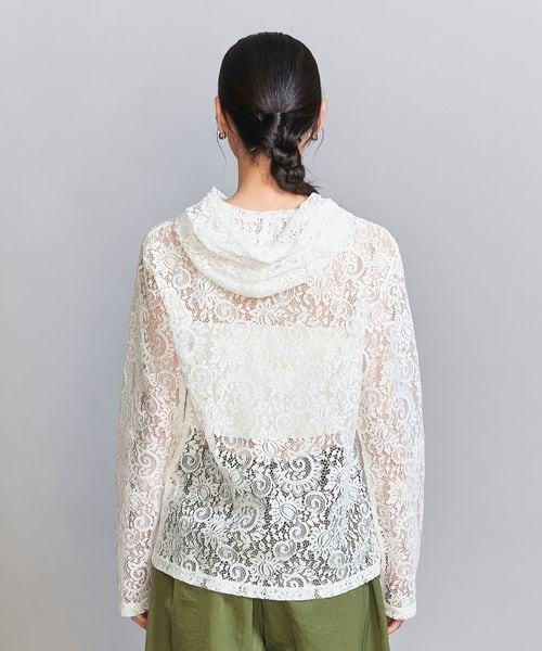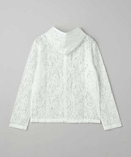 ドレッシーなレース素材を使用した、カジュアルなフーディ型トップス。
