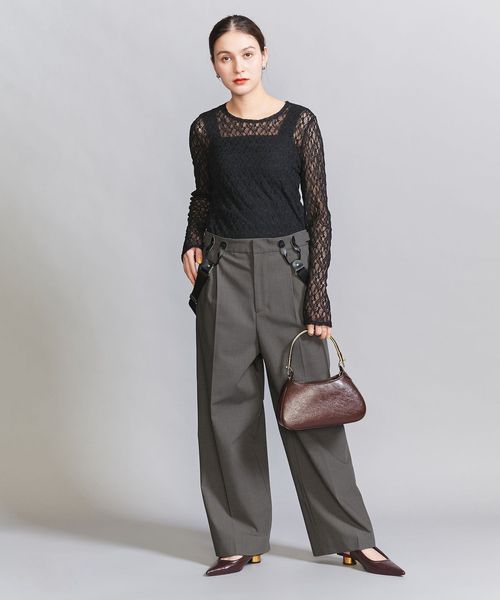 スキンレースやシアーインナーなどを合わせたモードな着こなしはもちろん、ウエストをアジャスターで絞り、サスペンダー無しのスラックスにハーフデニムを重ねて着るレイヤードスタイルもおすすめです。