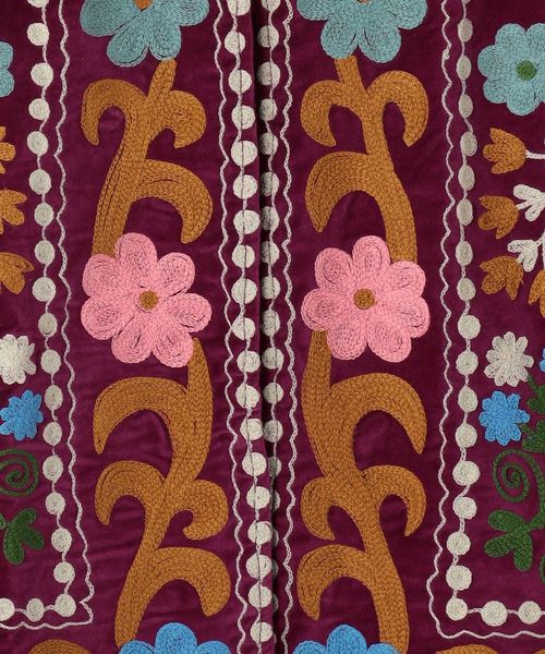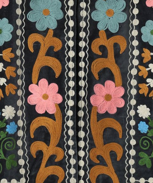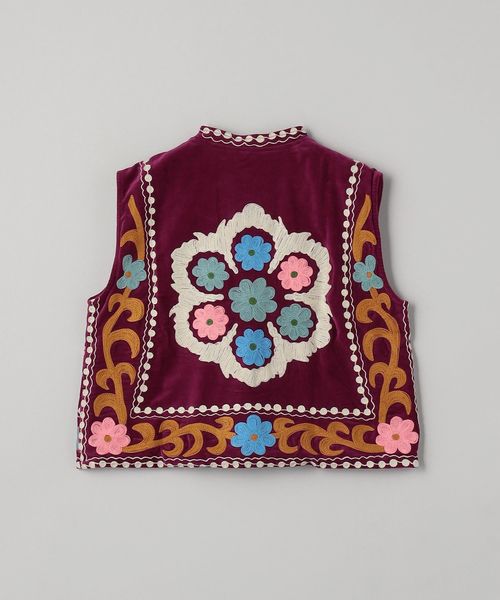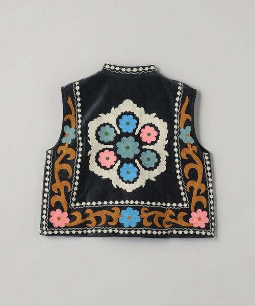 柔らかなベロア地にカラフルなカラーリングの芸術的な刺繍をあしらったベスト。