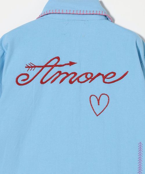 ハートや陰影のエンブレム、背中に書かれた“Amore(フランス語で愛)”などのシンボルをあしらった、コントラストカラーの刺繍で美しく装飾されています。