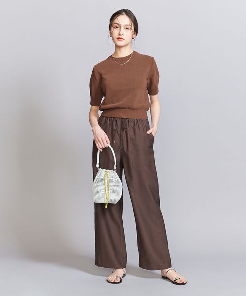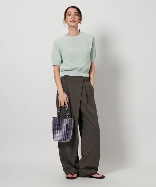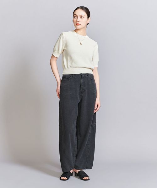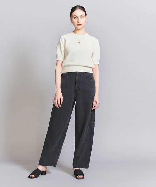 ややローライズのデニムに合わせ、ショート丈を活かしたヘルシーなコーデや、装飾的な刺繍パンツなどに合わせり、大人っぽく梳毛調素材のラップパンツを合わせたきれいめな着こなしもおすすめです。