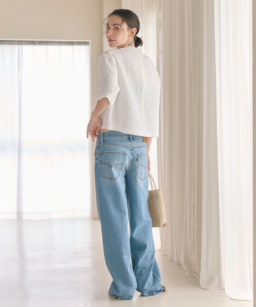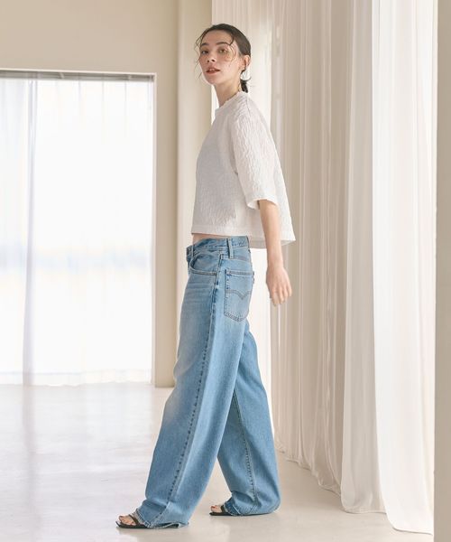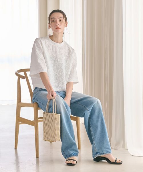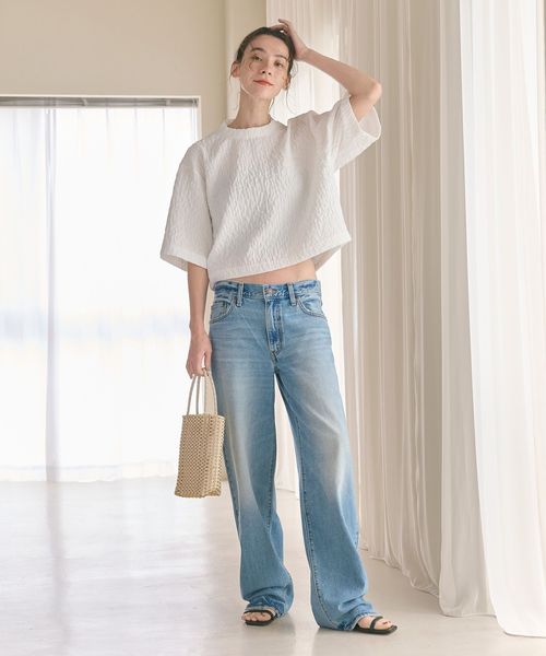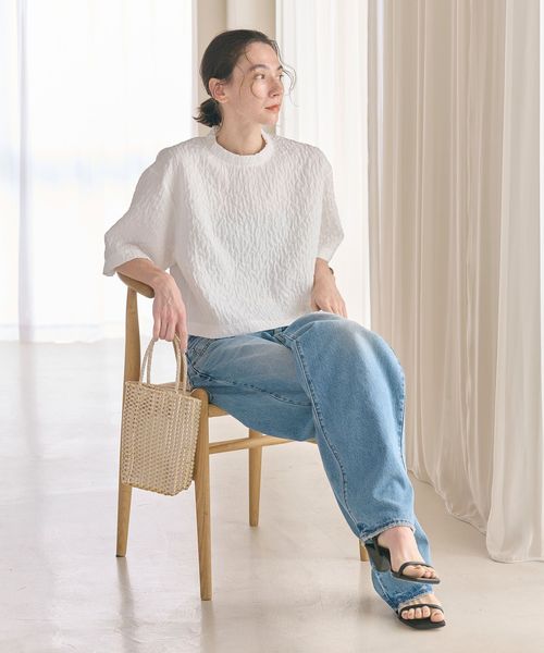 Iラインのデニムスカートや、ワイドパンツと合わせるのがおすすめ。