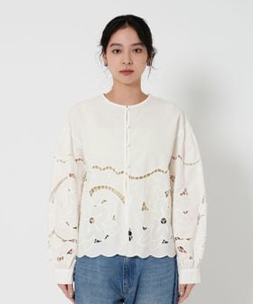 片耳スカラップ刺繍を別注で作成し、裾や袖に施したシャツ。