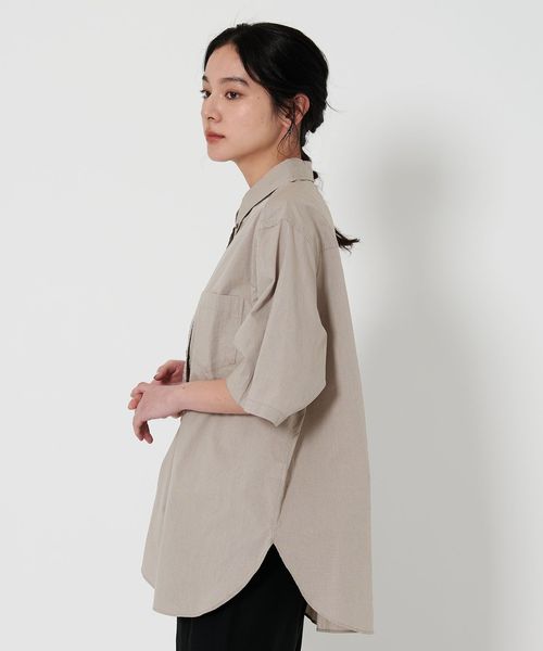 ユニセックスのシャツを着ているようなルーズなシルエットに仕上げているのが特徴。