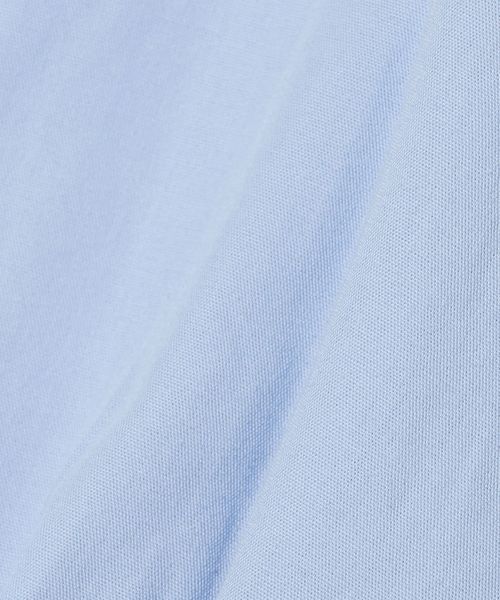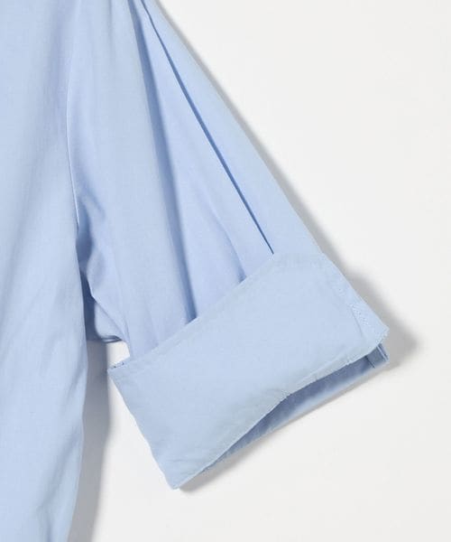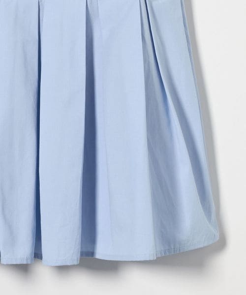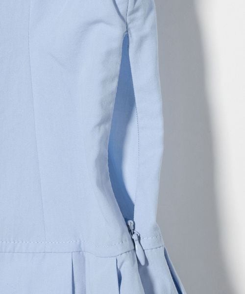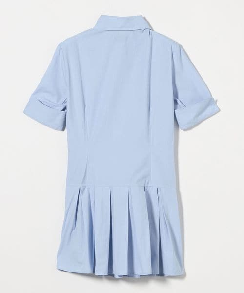 シャープなシャツカラーと短いカフス袖、フロントに同素材のボタン前立て、動きをプラスするプリーツ入りのフレアスカートが特徴です。