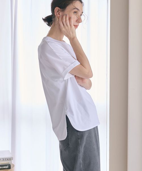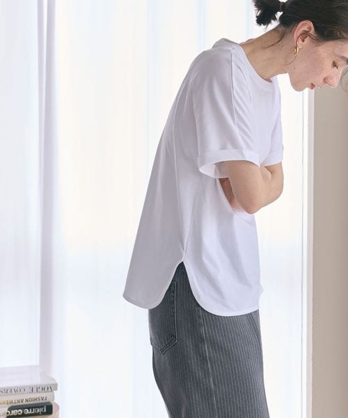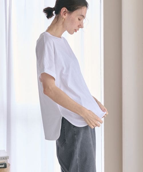 裾の緩やかなヘムラインが、シンプルになりがちなアイテムにアクセントをプラスし、アウトではもちろん、フロントをボトムにかけた着こなしも様になる一着です。