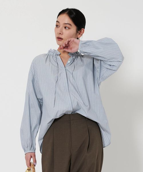 爽やかな素材で甘さを抑えたギャザーブラウス