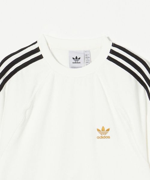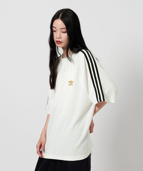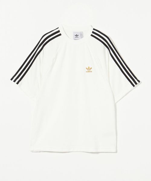 スリーブのスリーストライプスにゴールドのトレフォイルロゴが存在感を放つ、ショートスリーブTシャツ。
