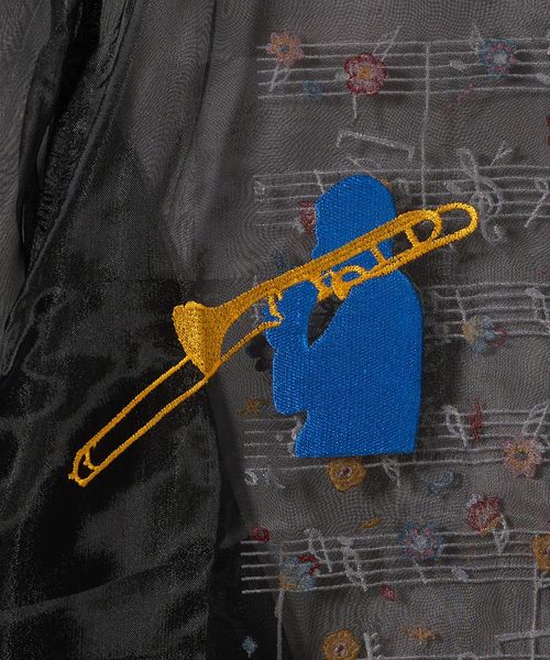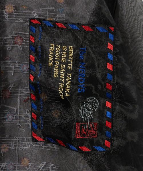 音楽家をイメージした人物やバックには華やかな楽譜の刺繍に、胸元には国際メール柄の刺繍に宛先を<THE NERDYS>にした特別感のあるデザインです。