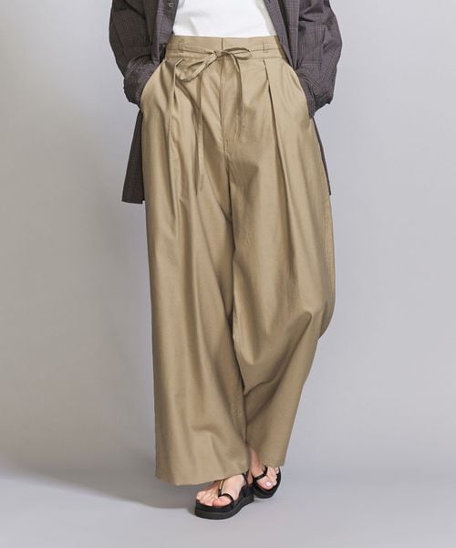 タックをあしらったフロントに共地の細いリボンベルトがポイントとなったワイドパンツ。