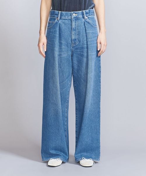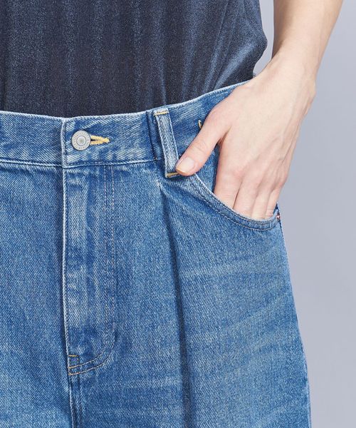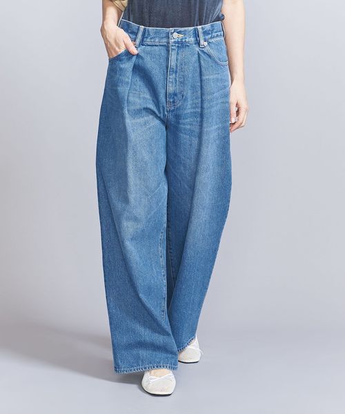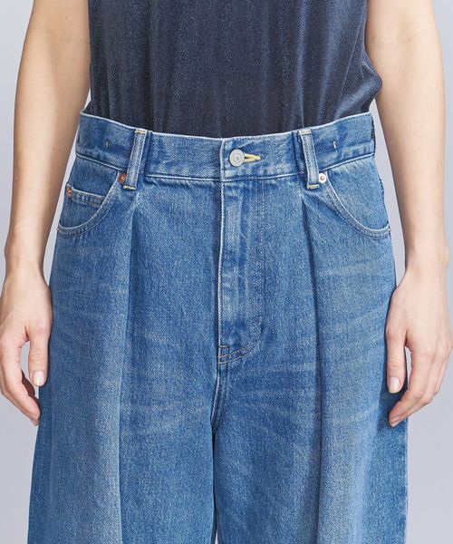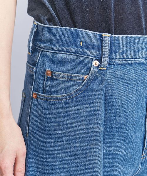 ベルトから折り込んで深めのタックを入れたデニムパンツ。