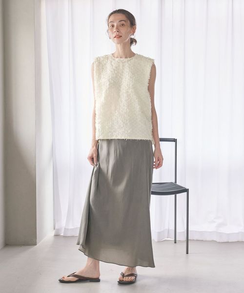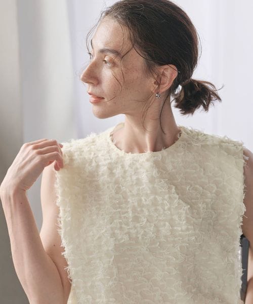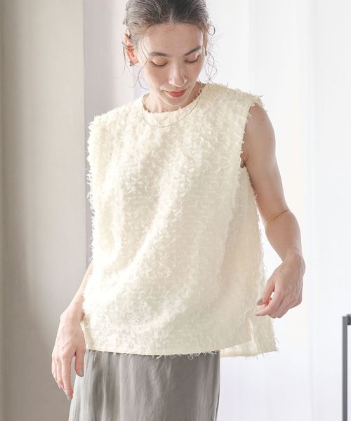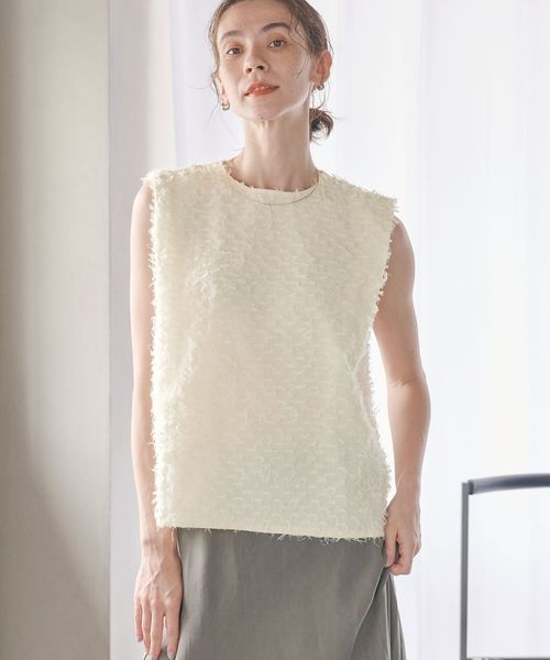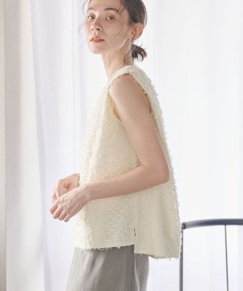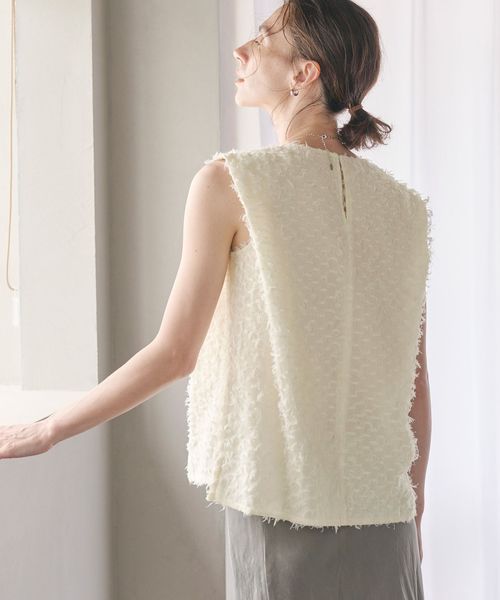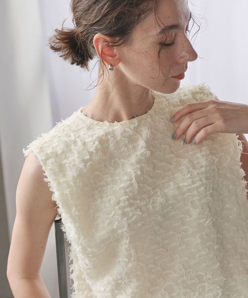 愛らしい印象のフリンジ素材を使用したノースリーブブラウス。