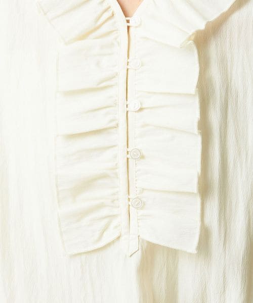 大胆に施したフリルが甘くなりすぎない大人のフェミニンスタイルへ導くブラウス。