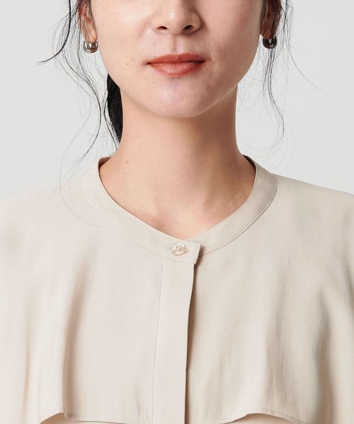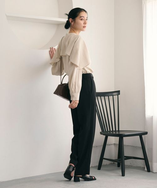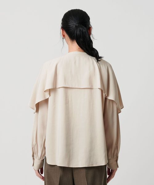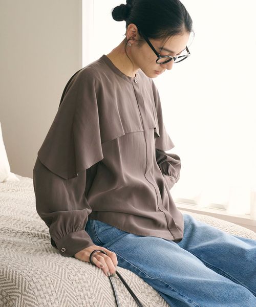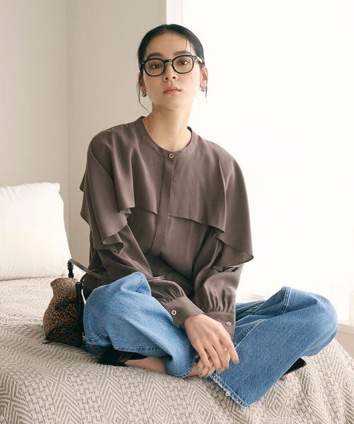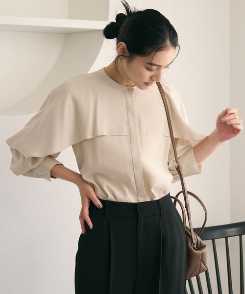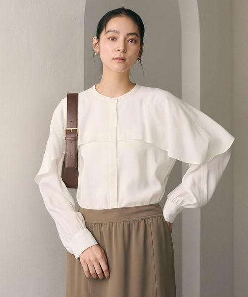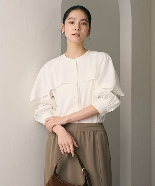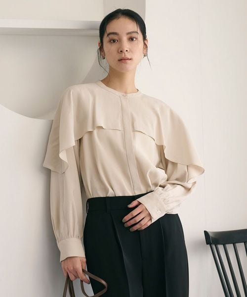 動きのあるケープ風のフリルが印象的なデザインブラウス。