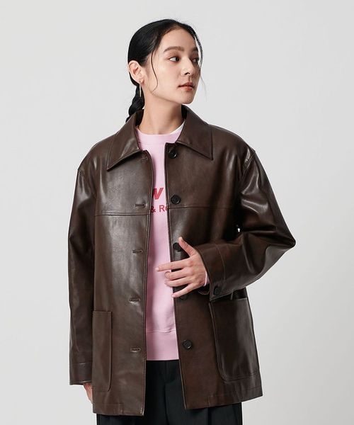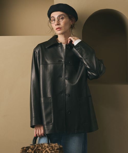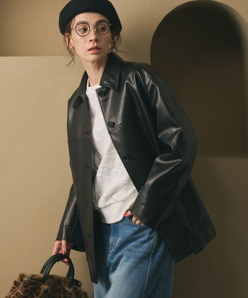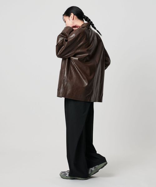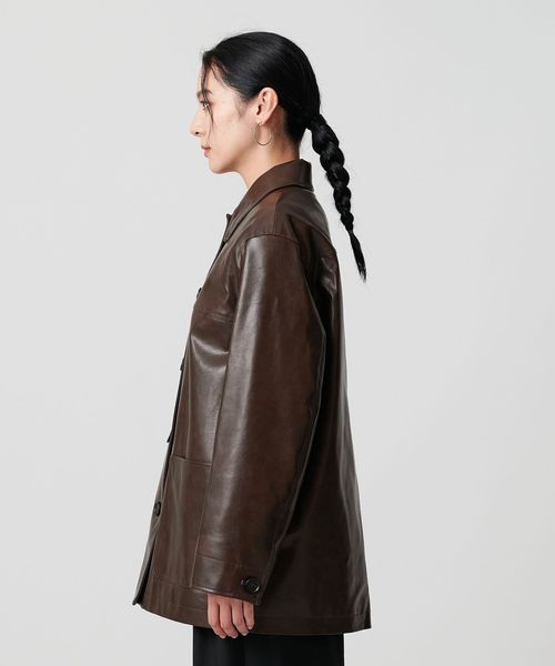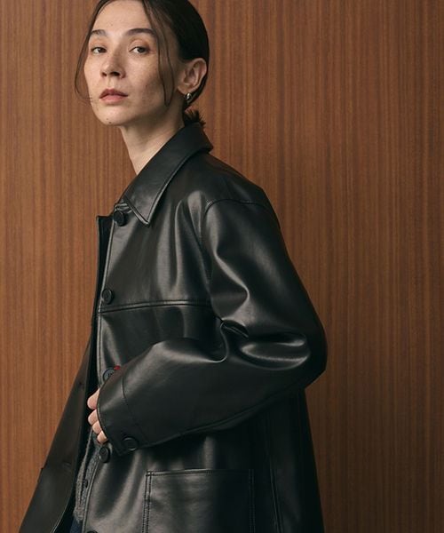 レザーライクな素材を使用したカバーオール型ジャケット。