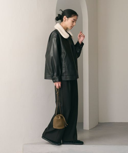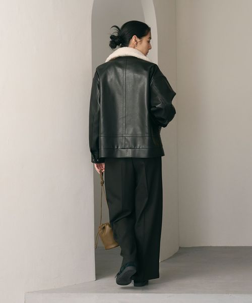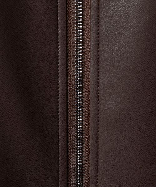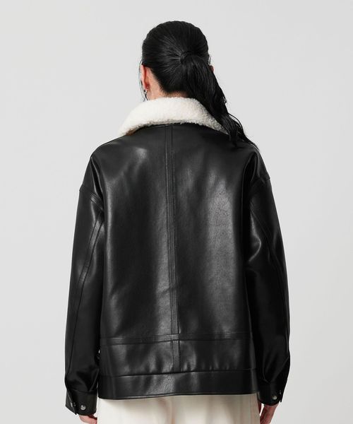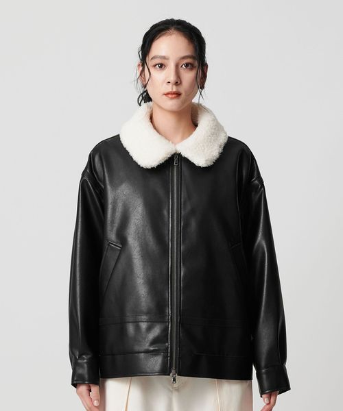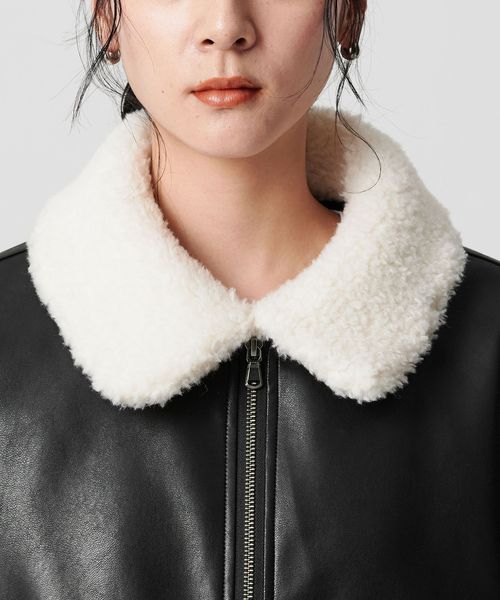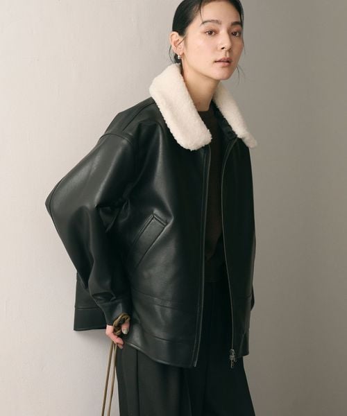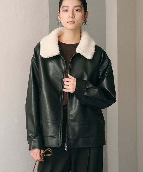 レザーライクな生地の上品な光沢感に、襟元のボアが愛らしさを添えるジップブルゾン。
