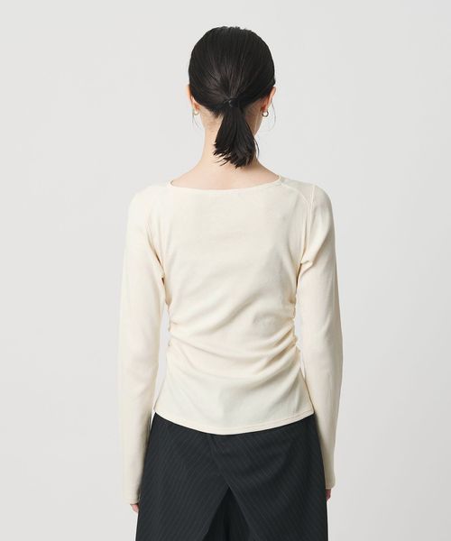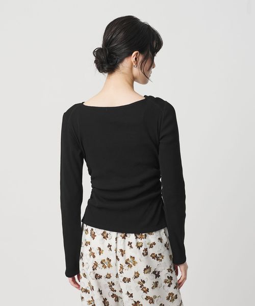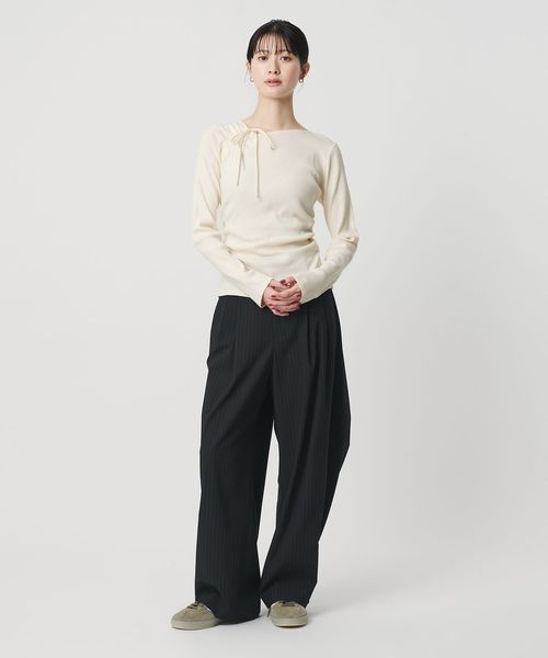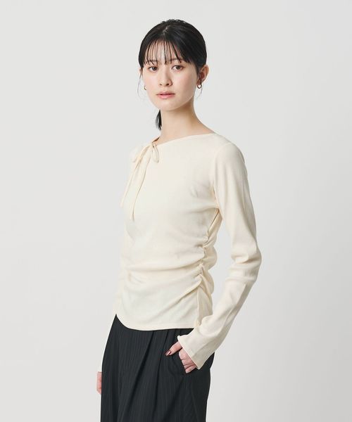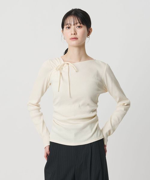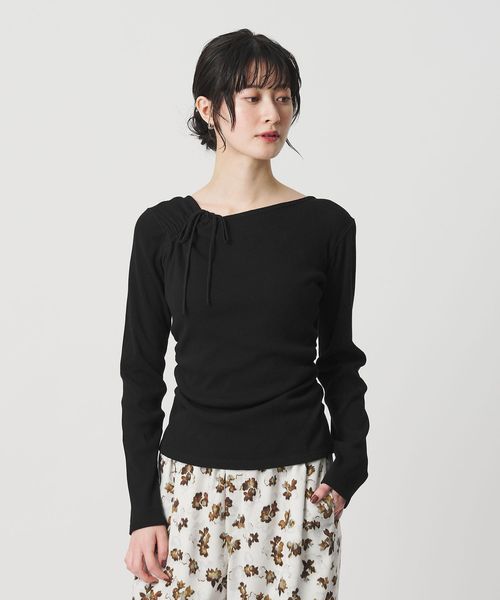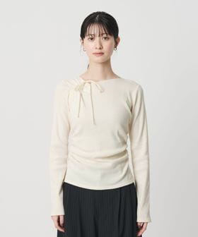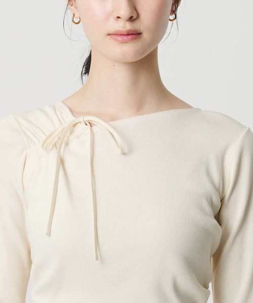 ギャザーが寄せられるリボンが付いたアシンメトリーな襟ぐりは、デコルテをすっきりと見せてくれます。