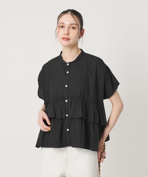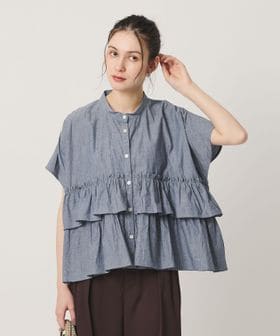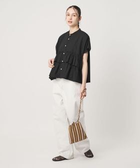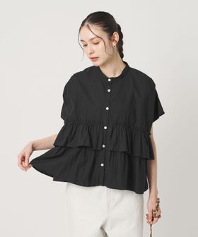 すっきりとしたノーカラーにフリルを施したショートスリーブブラウス。