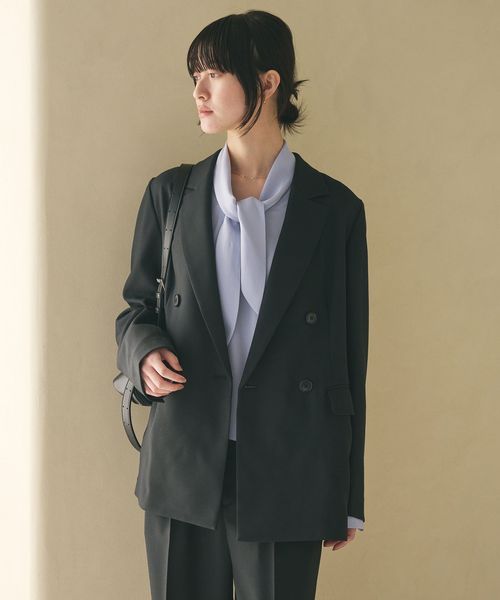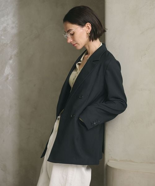 一重仕立てで軽く仕上げた4つボタンのブレザー風ダブルジャケット。