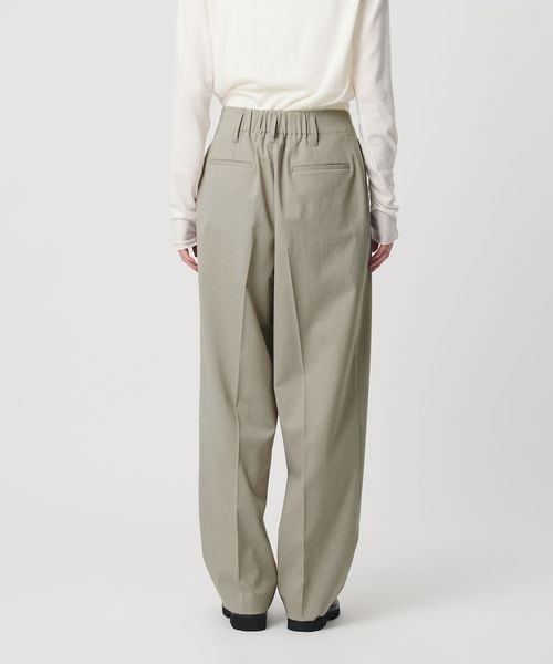 ナチュラルなテーパードシルエットにセンタープレスが入りきちんと感がありながらも、ゆとりのある腰回りやバックゴム仕様でリラックスしてはけるのも魅力。