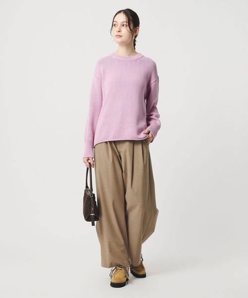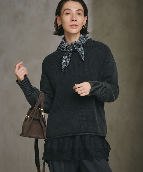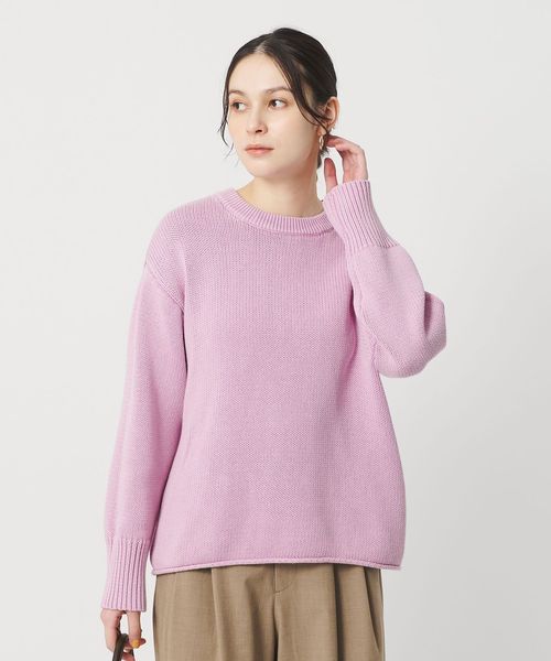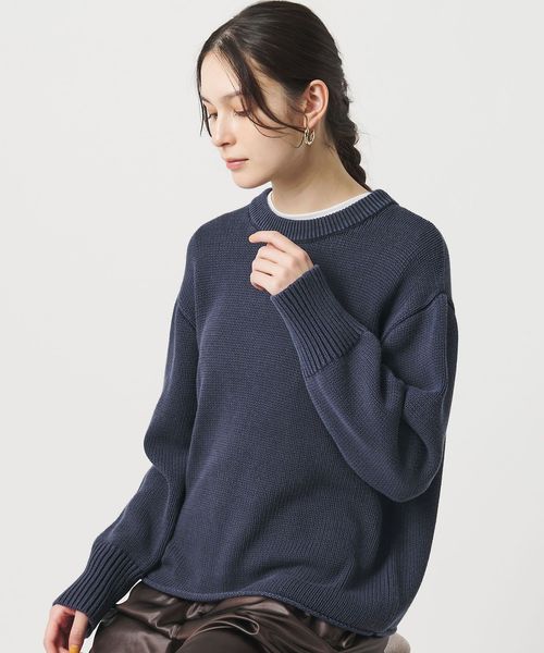 編み端をロールさせた裾がアクセント。