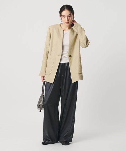 ゆったりとしたシルエットのカジュアルなパンツでありながら、落ち感とツヤのある陰影の美しい生地を使用し、大人な印象で着られる一着に仕上げました。