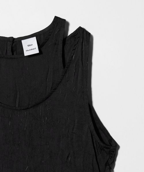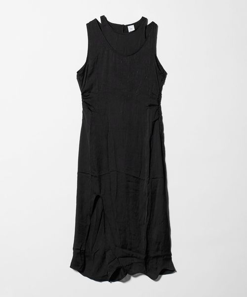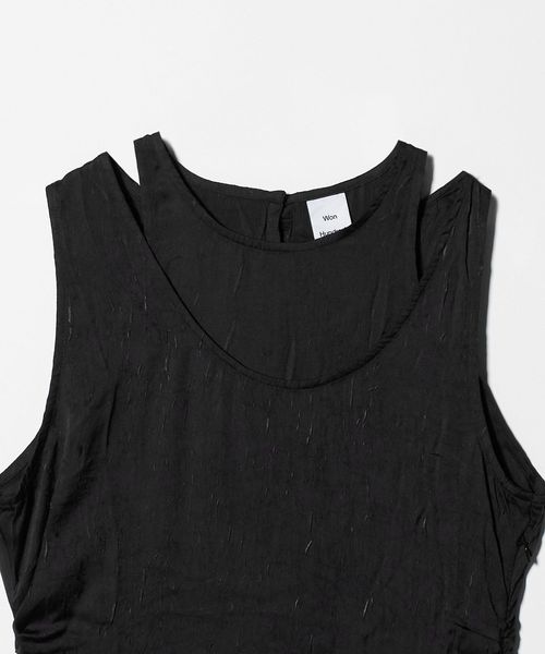 2枚仕立てのトップス部分は左右が非対称で一癖あるルックスに仕上がっています。