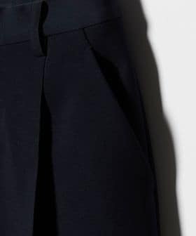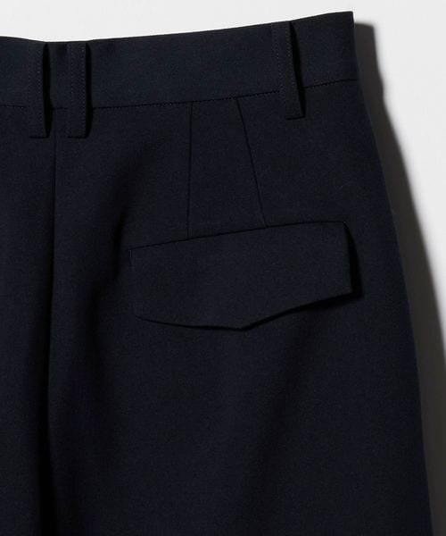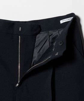 センタープレスやワイドヘムのディテールが効いた凛とした佇まいの一着。