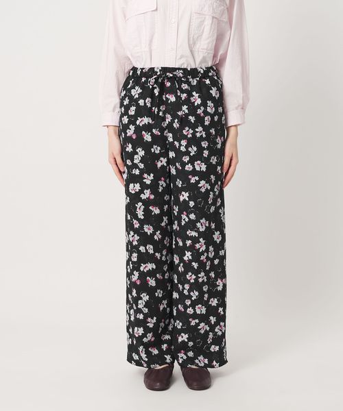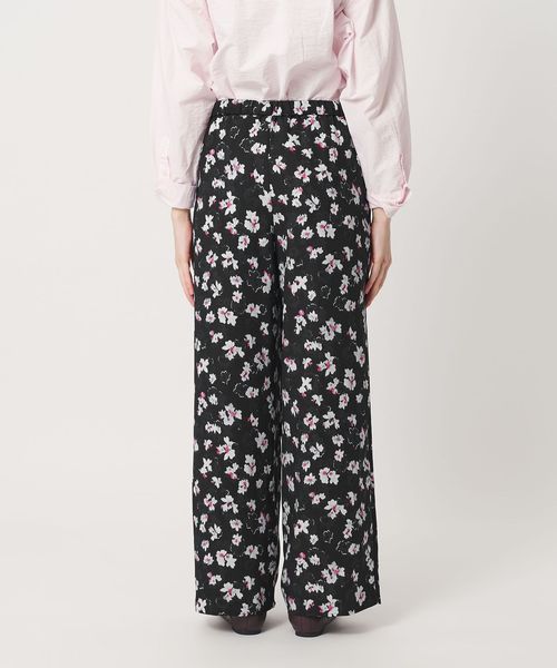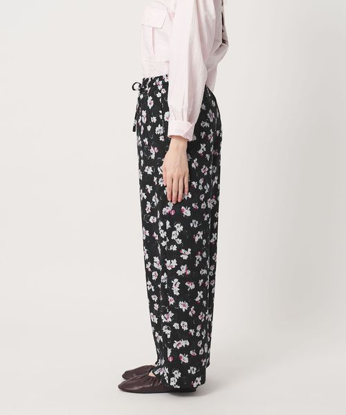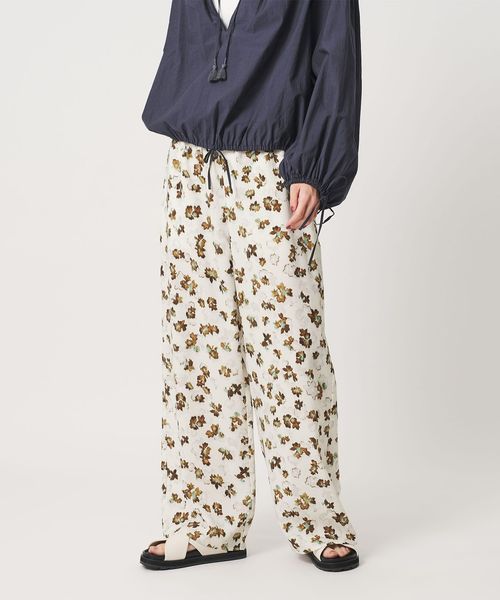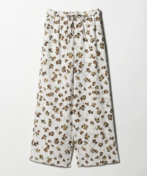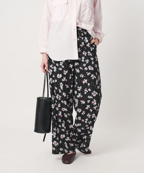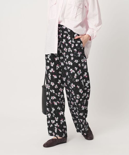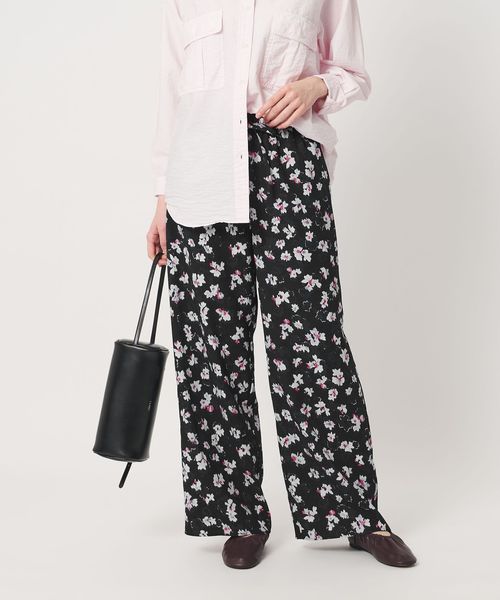 装いに華やかさを添えるフラワープリントのワイドパンツ。