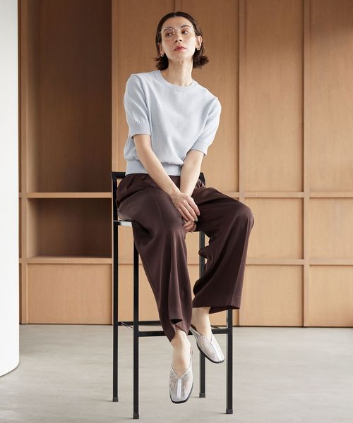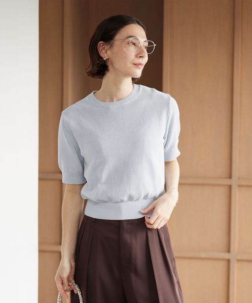 コイル形状の糸を使用した、端正な編地がポイントのショートスリーブニット。