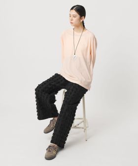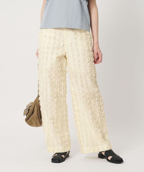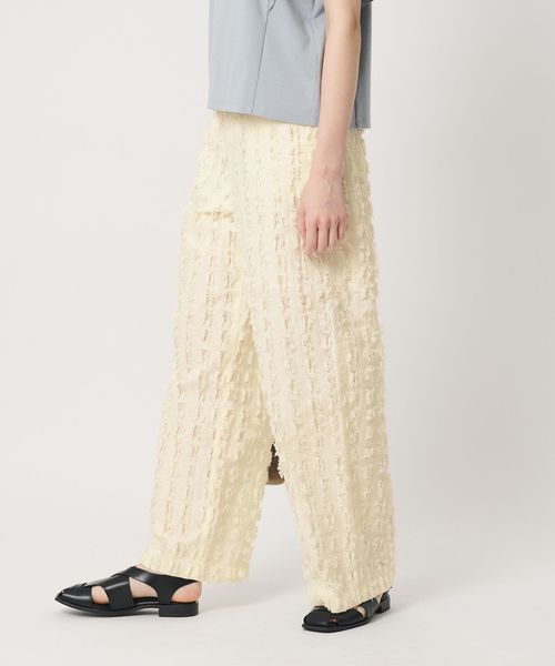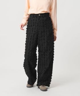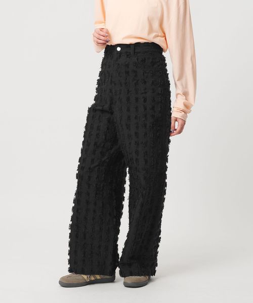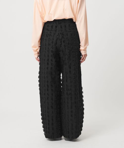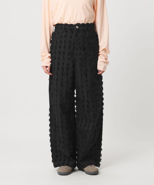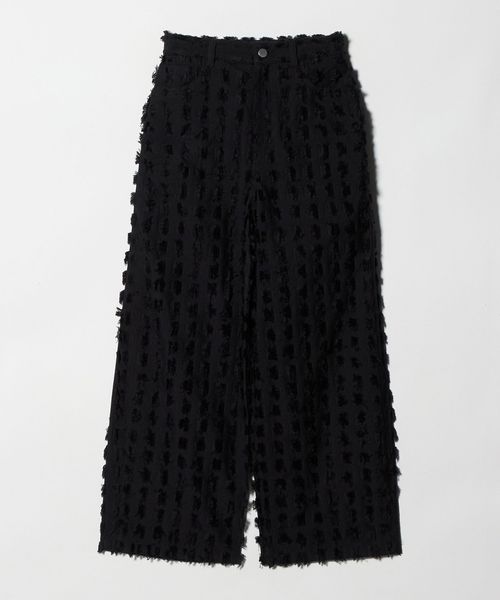 大きめなスクエアのカットジャガードで表現したフリンジが印象的なパンツ。