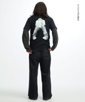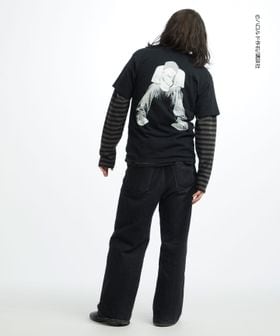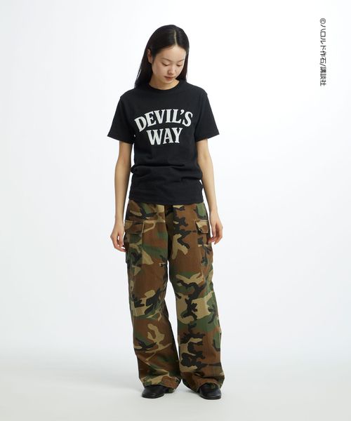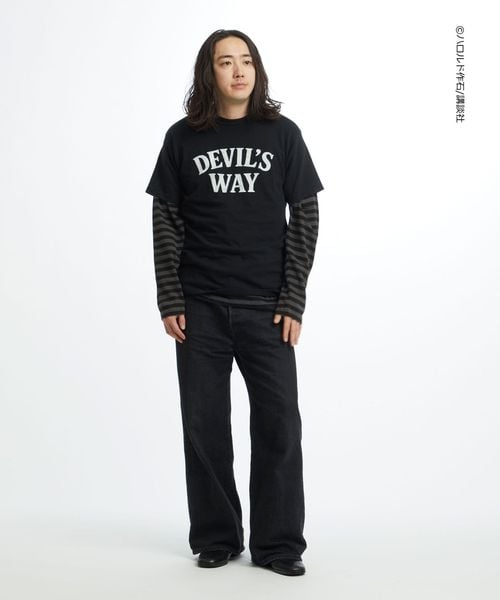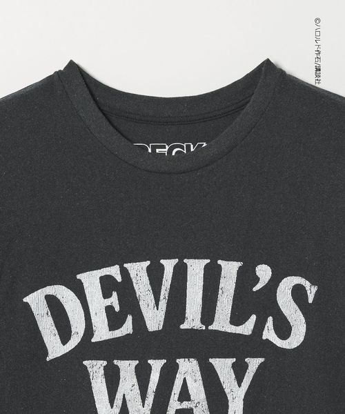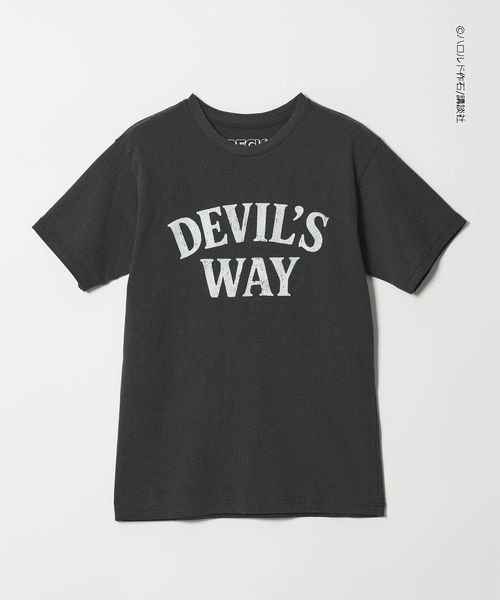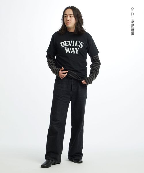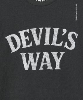 フロントは「DEVIL’S WAY」をクラックプリント、ボディにブリーチ加工を施し毛羽立たせる<フロスト>加工を施すことでヴィンテージ感を演出。