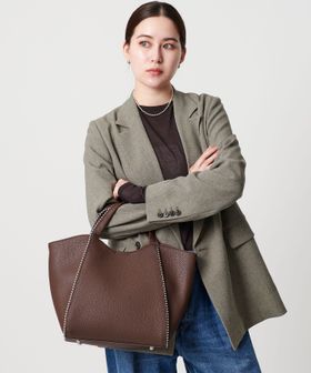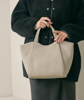 ハンドルから本体部分にかけて、ボールチェーンのアクセントをあしらったトートバッグ。