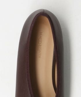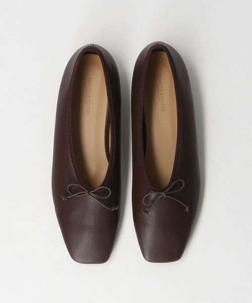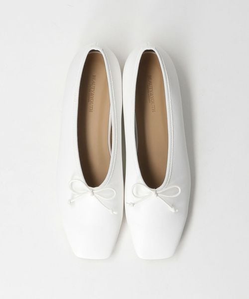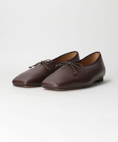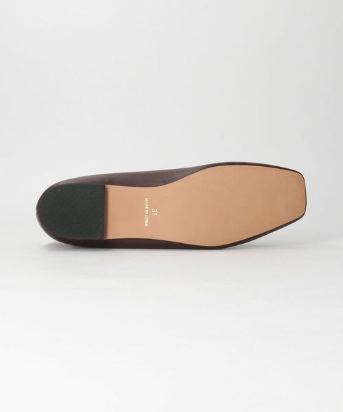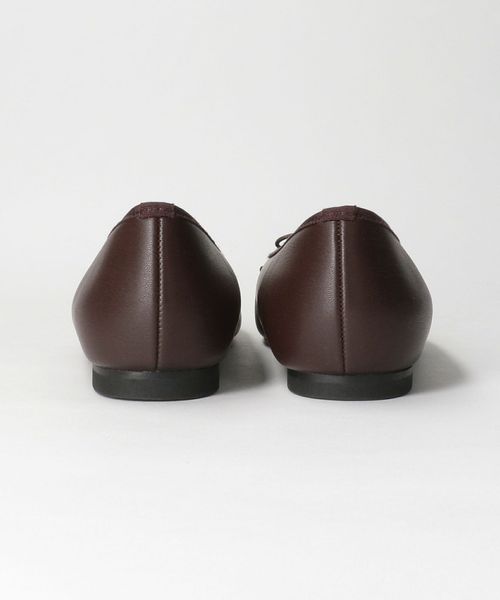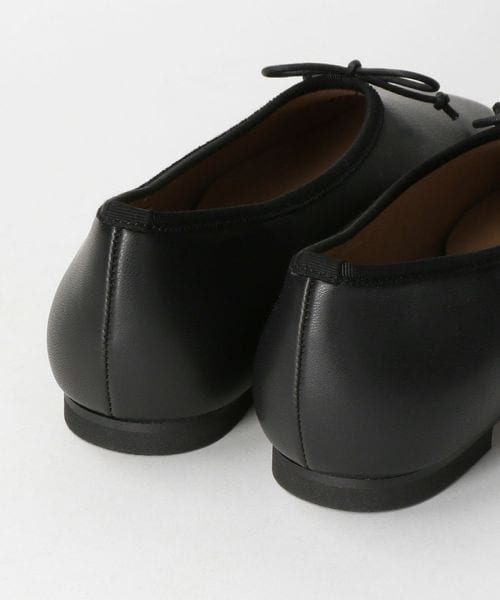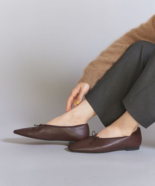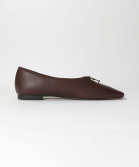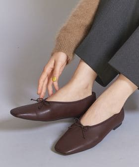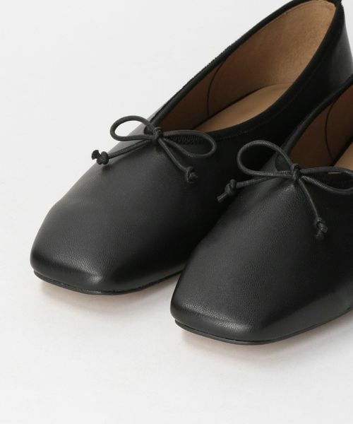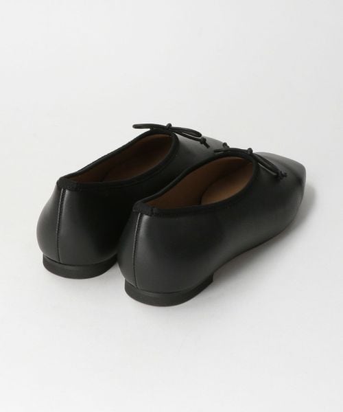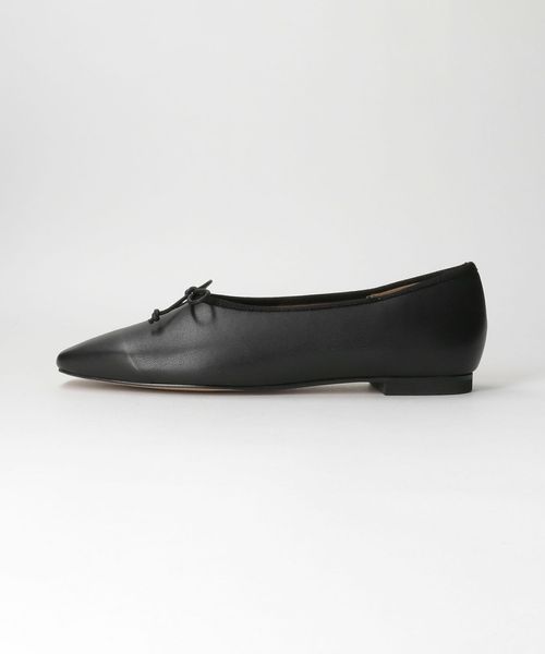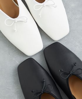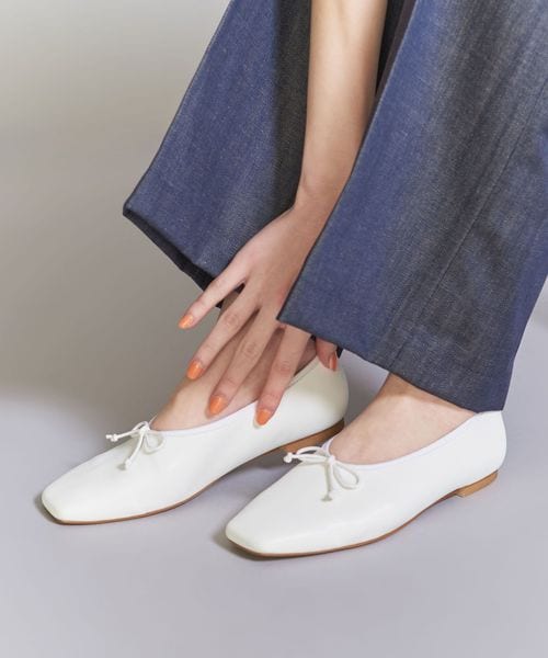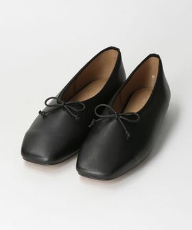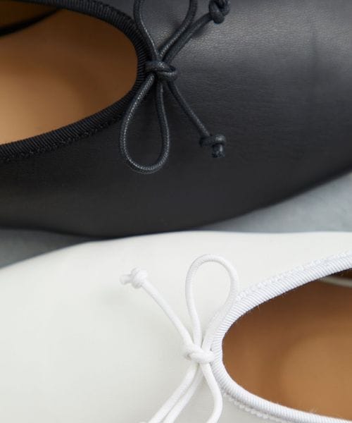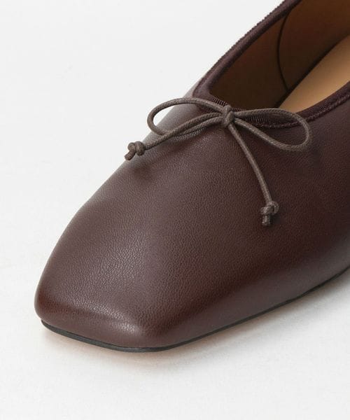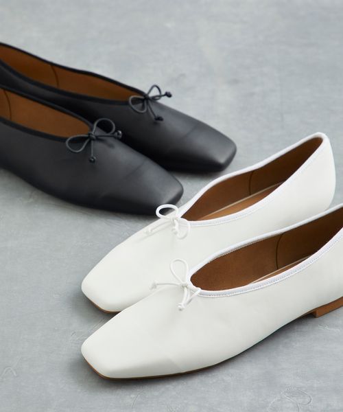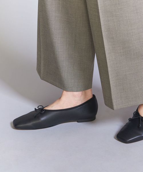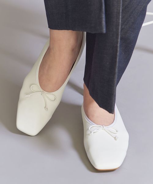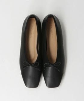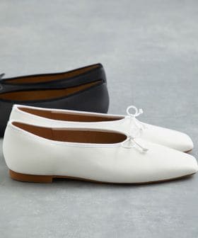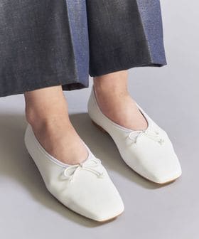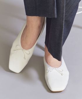 スクエアトゥで仕上げたつま先にさりげないリボンデザインが、甘くなりすぎない大人な雰囲気を醸し出すバレエシューズ。