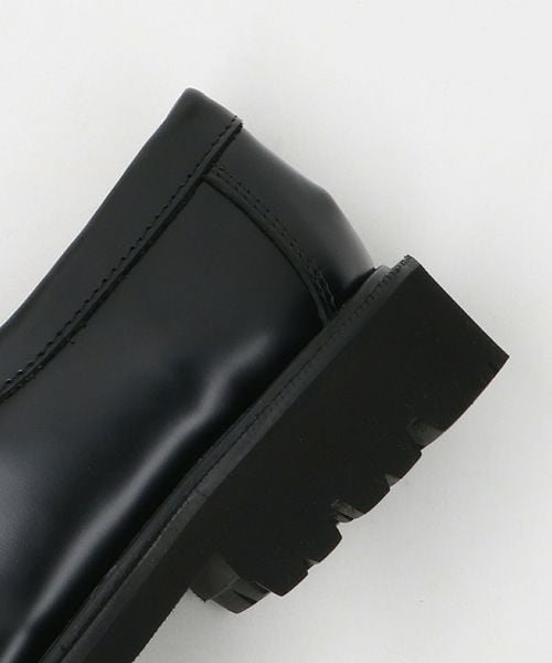 ボリューム感のある太めのローヒールと、履き込みが深めな帯部分がクラシカルな印象に導いてくれるコインローファー。