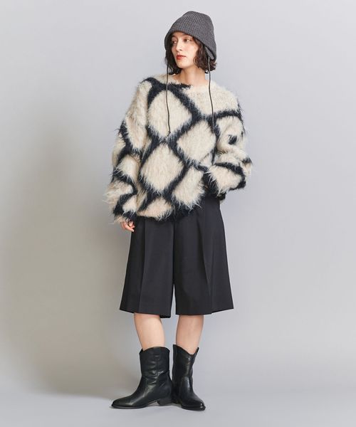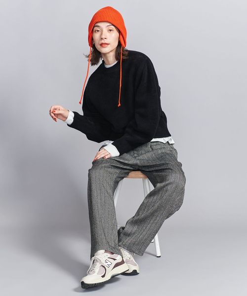 ニット特有の柔らかい素材感は、メンズライクなゆったりシルエットのコーディネートをバランスよく見せてくれます。