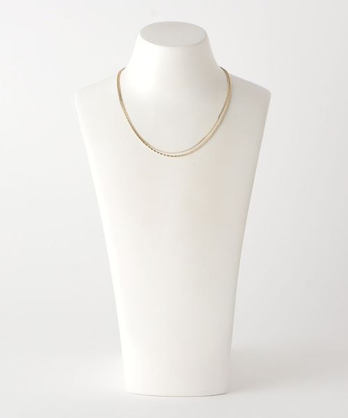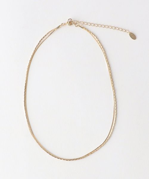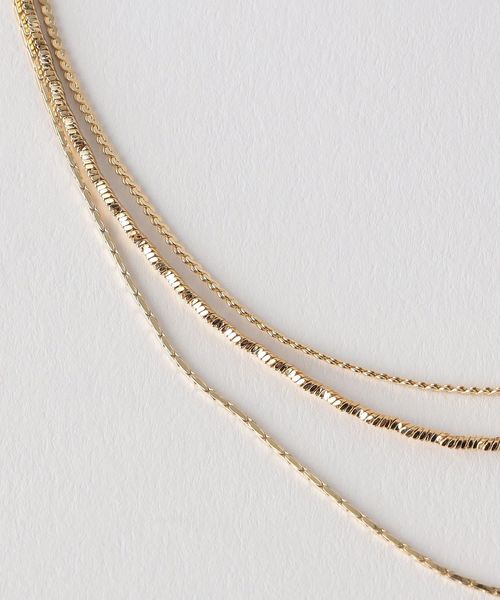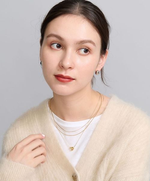 重ね付けして見える存在感あるネックレスは、シンプルなコーディネートが引き立つアイテム。