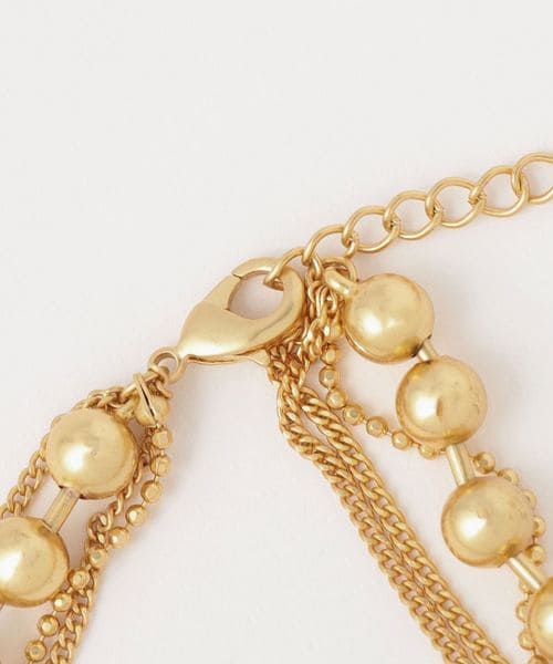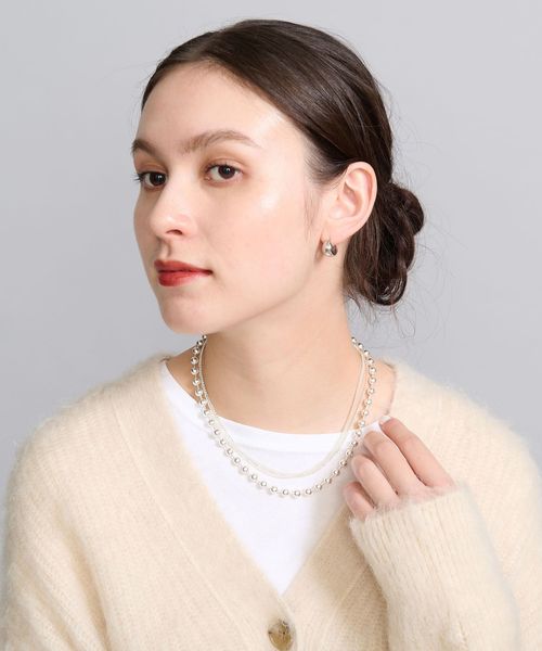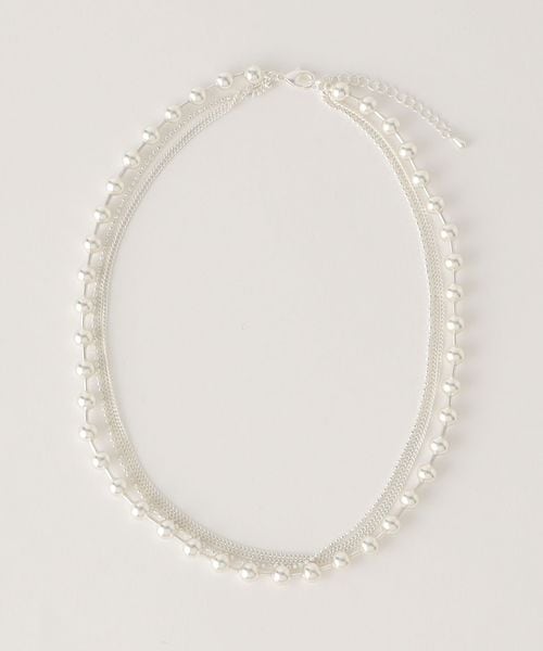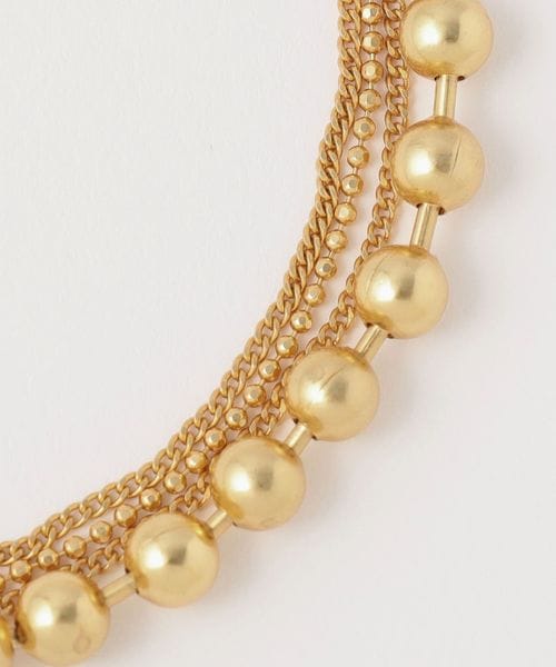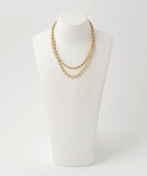 異なる3連チェーンとボールチェーンを重ね付けしたようなボリューム感あるネックレス。