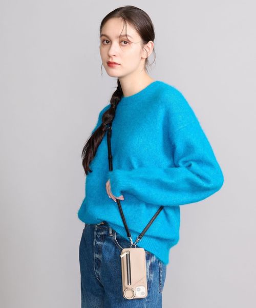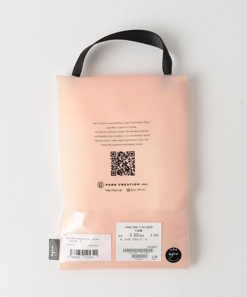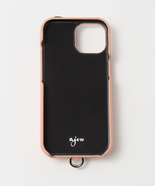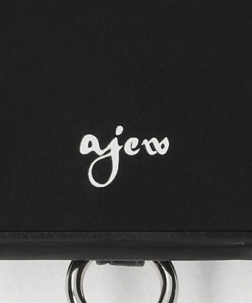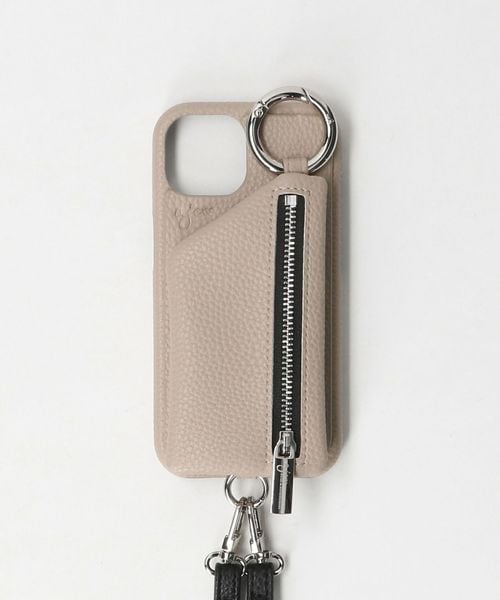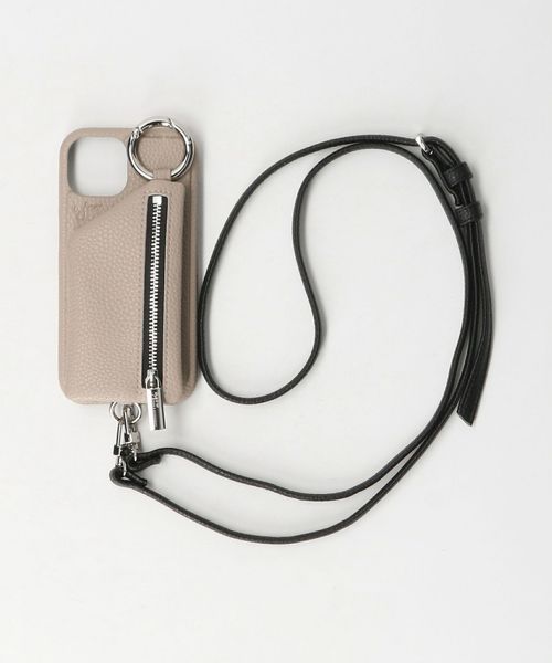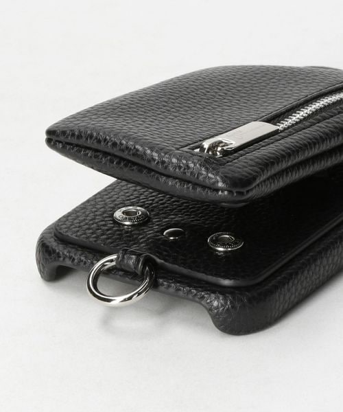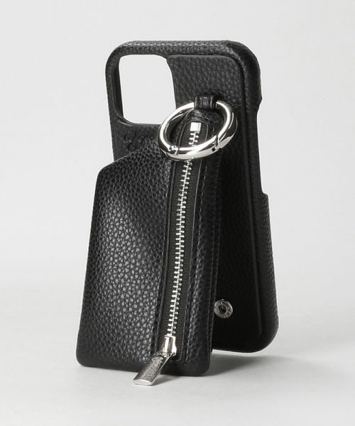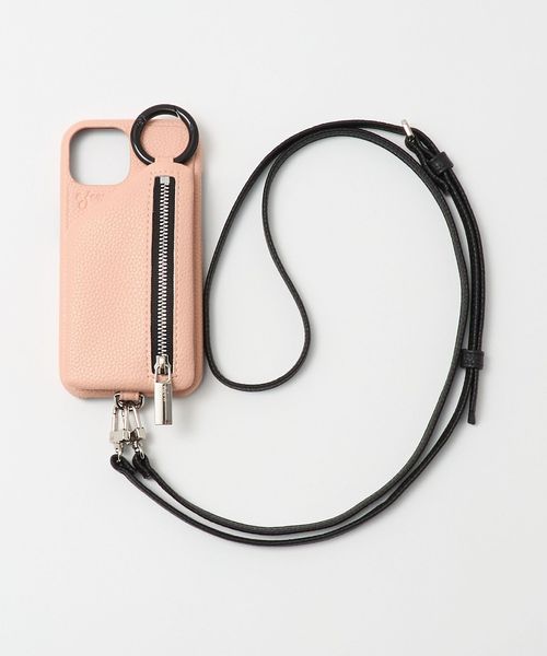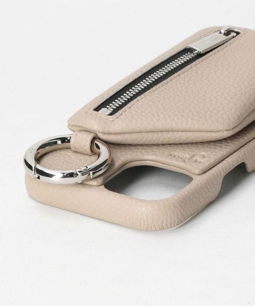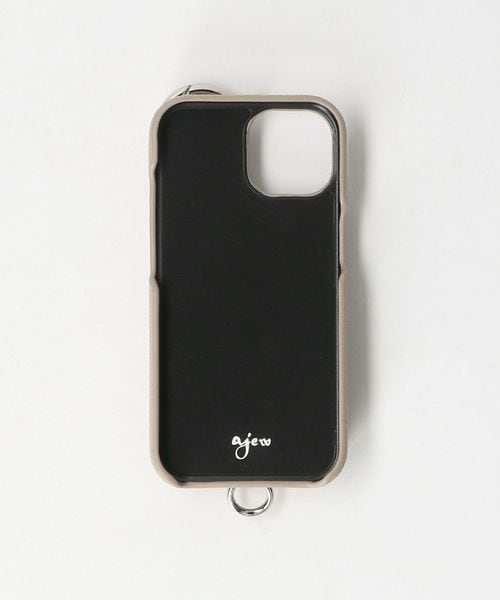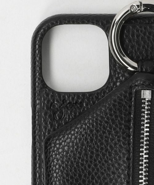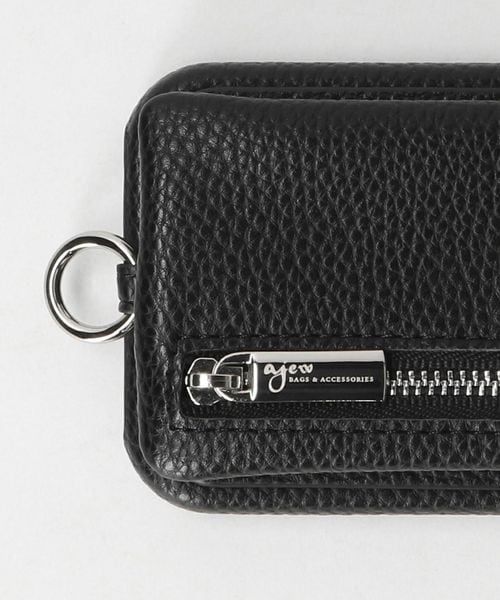 <ajew>の定番ケース"ajew cadenas zipphone case shoulder"は、シルバーカラーのリングとファスナーポケットが象徴的な定番モデル。