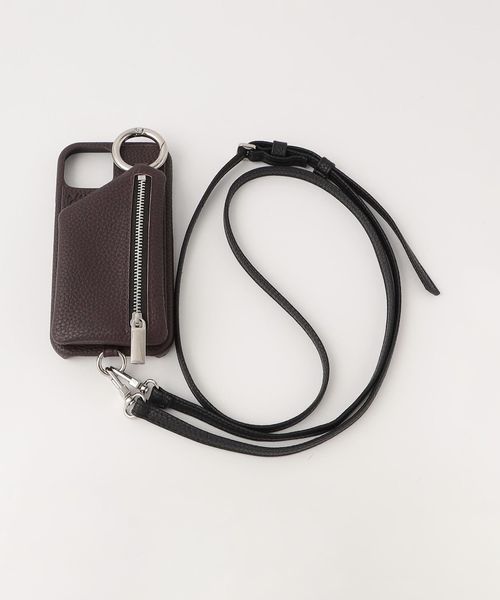 <ajew>の定番ケース"ajew cadenas zipphone case shoulder"は、シルバーカラーのリングとファスナーポケットが象徴的な定番モデル。